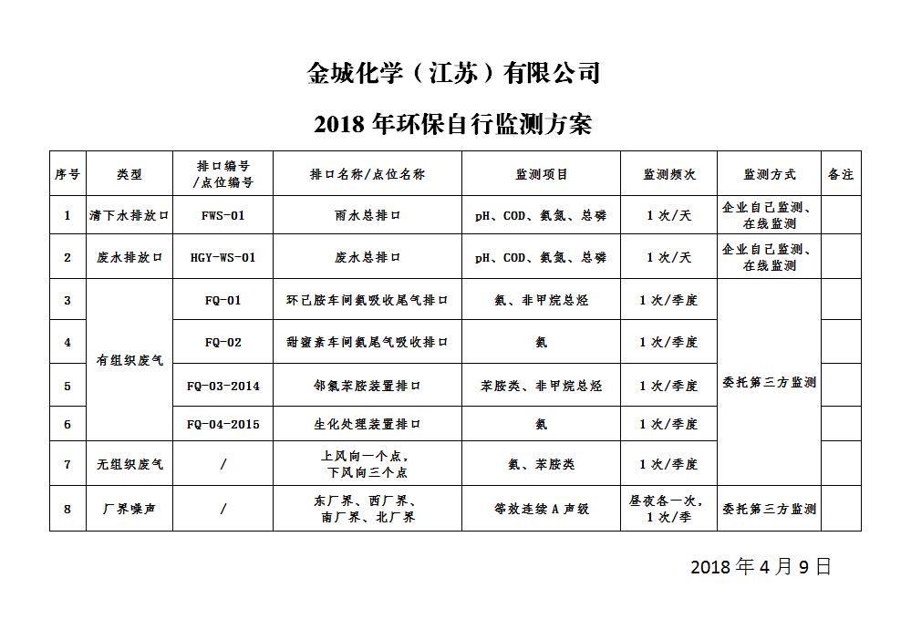 金城化學(xué)2018年環(huán)保自行監(jiān)測方案